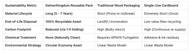 DeliverKingdom의 100% 재활용 가능한 슬리브 팩은 순환 경제를 지원합니다. 친환경 B2B 물류를 위해 설계된 내구성이 뛰어나고 재사용 가능한 팔레트 박스를 사용하여 폐기물과 탄소 배출량을 줄이세요.